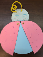 I found half of this craft in our stock pile of leftovers. Its just a giant bin of crafts that weren't used up at previous activities. I do love brass fasteners so I liked the idea of the wings moving on our ladybug. The head, body and wings were all different pieces. I wanted to minimized supplies for our first day back to storytime so I just glued all the heads on the bodies ahead of time. This meant all the kids needed were two brads, crayons and their pipe cleaner. The pipe cleaner was threaded through two holes in the top of the ladybug's head. Which if you think about is the back of the bugs head so don't ask me why I drew eyes on my craft; anatomically I think thats the complete wrong place. Overall the kids liked it. Next time I would make a template with the head already attached.